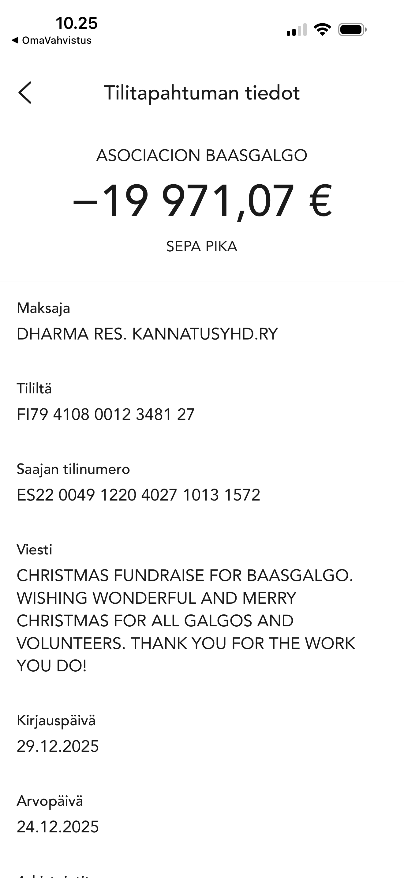 Keräsimme varoja Baasgalgolle 17.-23.12.2025 välisenä aikana. Keräys tuotti 19 971,07€. Tarhalta tulleen tiedon mukaan kaikki saadaan näillä näkymin pelastettua ja lisäksi hoitokuluja katettua. Baasgalgo on voinut keräyksen avulla hakea turvatarhan suojiin jo 9 galgoa jotka voivat jatkaa siellä toipumistaan. Vapaaehtoisia ja kuljetuksia järjestellään lisää viikonlopuksi ja seuraavalle viikolle jolloin lisää galgoja saadaan turvaan, perjantaiksi joulupyhien jälkeen kuljetus on varattu jo yhdelle galgolle. Lisäksi saimme tiedon että toinen turvatarha, FBM, on hakenut turvaan 7 galgoa. Tämä tarkoittaa että Baasgalgo pystyy ottamaan suojiinsa vielä uusia galgoja kunhan turvatarhalta vapautuu tilaa adoptioiden tai kotihoidon myötä. Lisäksi varojen turvin voidaan jatkaa Baasgalgolla olevan Fenixin kuntoutusta ja katetaan kuukausittaisia hoitokuluja.